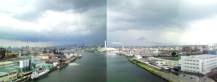 ループの巨塔を登る。 頂上へたどり着く決意だけで、出会う人さえない杣道を単独登攀。 黒煙を噴出すヘビ花火はくるくると火炎を巻いて三段、四段とせり上がる。 アーチ橋。両端の橋脚は「初めと終わり」のベクトルを支える「あっ」「うん」の獅子の力、高さを誇って躍動している。 その逞しい野獣の四足は美しい水色、ジャングルから覗いた隙間の視界に異彩を放つ仏塔の様に覆い被さってくる。 登りきった、眼まわる、そこからは自らを妄想人と化して。 橋は舞台。この舞台でなにを演じるのか。 上手から下手へ、ただ黙って歩んでも観客の目は我を追うのか。 灰色に濁った雲塊の下に何者にも媚びない自然の茫々たる原野のように人造パノラマの舞台装置は弓なりに悠々と横たわっている。 橋の向こうは過去か未来か。 過去に怒ってみせようか、未来に降伏する兵士の役をしてみようか。 大正から平成へ、いや、大正区から住之江区へのショート・カット、 こんな橋を渡って、人生は思わぬ処にたどり着いてしまう、何処へ? そろそろ人生の秋のよわいとなったが、 白痴の如く幼い元気さが残っている、そういうもの以外は自分に備わってこなかったかも・・・ 大勢の行進に呑まれて、ある時、浮雲の思いに浸り、水の藍染めの羅紗のさざめきに目を奪われてると 止まる!止まる!